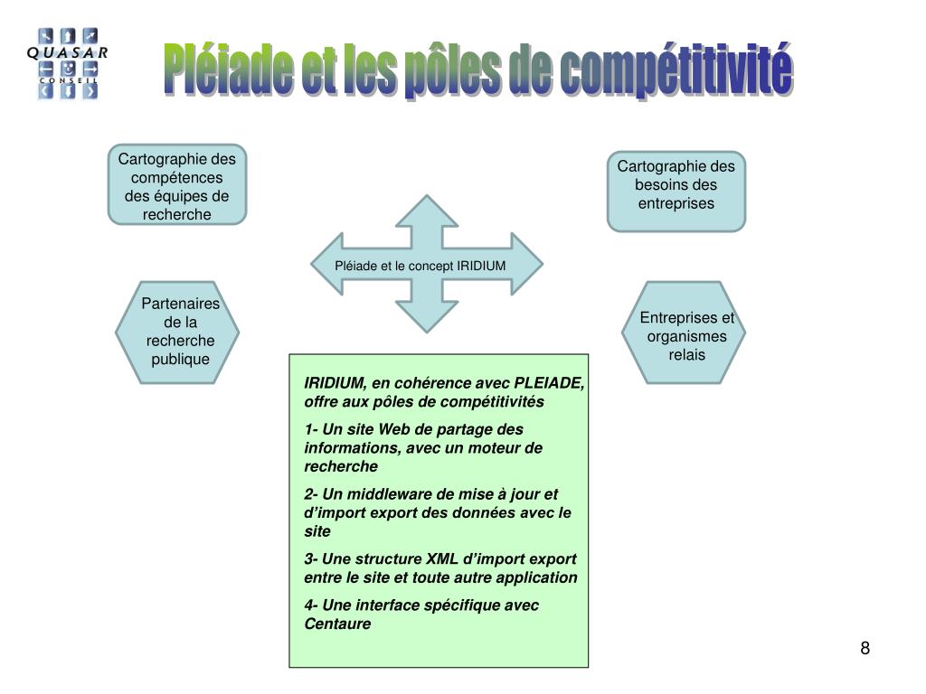 Pléiade et les pôles de compétitivité Cartographie des compétences des équipes de recherche Cartographie des besoins des entreprises Pléiade et le concept IRIDIUM Partenaires de la recherche publique Entreprises et organismes relais IRIDIUM, en cohérence avec PLEIADE, offre aux pôles de compétitivités 1- Un site Web de partage des informations, avec un moteur de recherche 2- Un middleware de mise à jour et d’import export des données avec le site 3- Une structure XML d’import export entre le site et toute autre application 4- Une interface spécifique avec Centaure