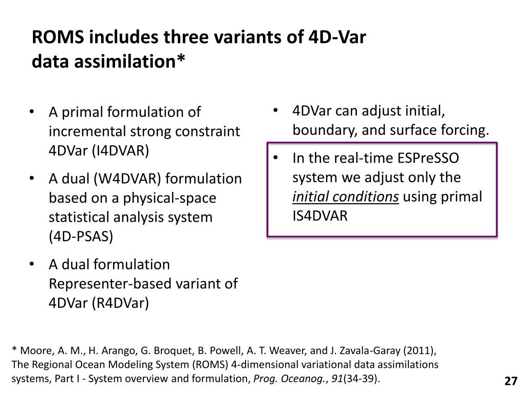 A primal formulation of incremental strong constraint 4DVar (I4DVAR) A dual (W4DVAR) formulation based on a physical-space statistical analysis system (4D-PSAS) A dual formulation Representer-based variant of 4DVar (R4DVar) 4DVar can adjust initial, boundary, and surface forcing. In the real-time ESPreSSO system we adjust only the initial conditions using primal IS4DVAR ROMSincludes three variants of 4D-Var data assimilation* * Moore, A. M., H. Arango, G. Broquet, B. Powell, A. T. Weaver, and J. Zavala-Garay (2011), The Regional Ocean Modeling System (ROMS) 4-dimensional variational data assimilations systems, Part I - System overview and formulation, Prog. Oceanog., 91(34-39). 27