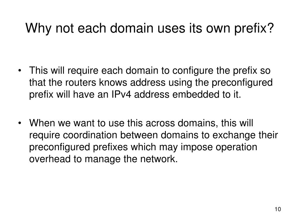 Why not each domain uses its own prefix? • This will require each domain to configure the prefix so that the routers knows address using the preconfigured prefix will have an IPv4 address embedded to it. • When we want to use this across domains, this will require coordination between domains to exchange their preconfigured prefixes which may impose operation overhead to manage the network.