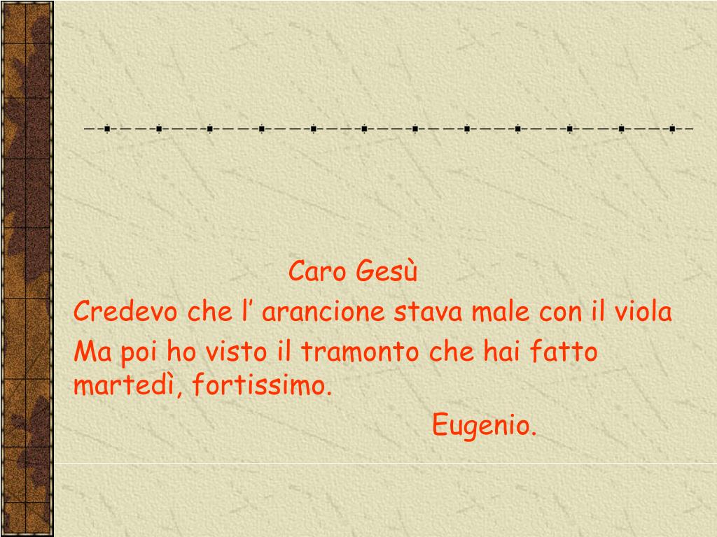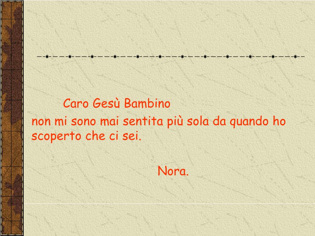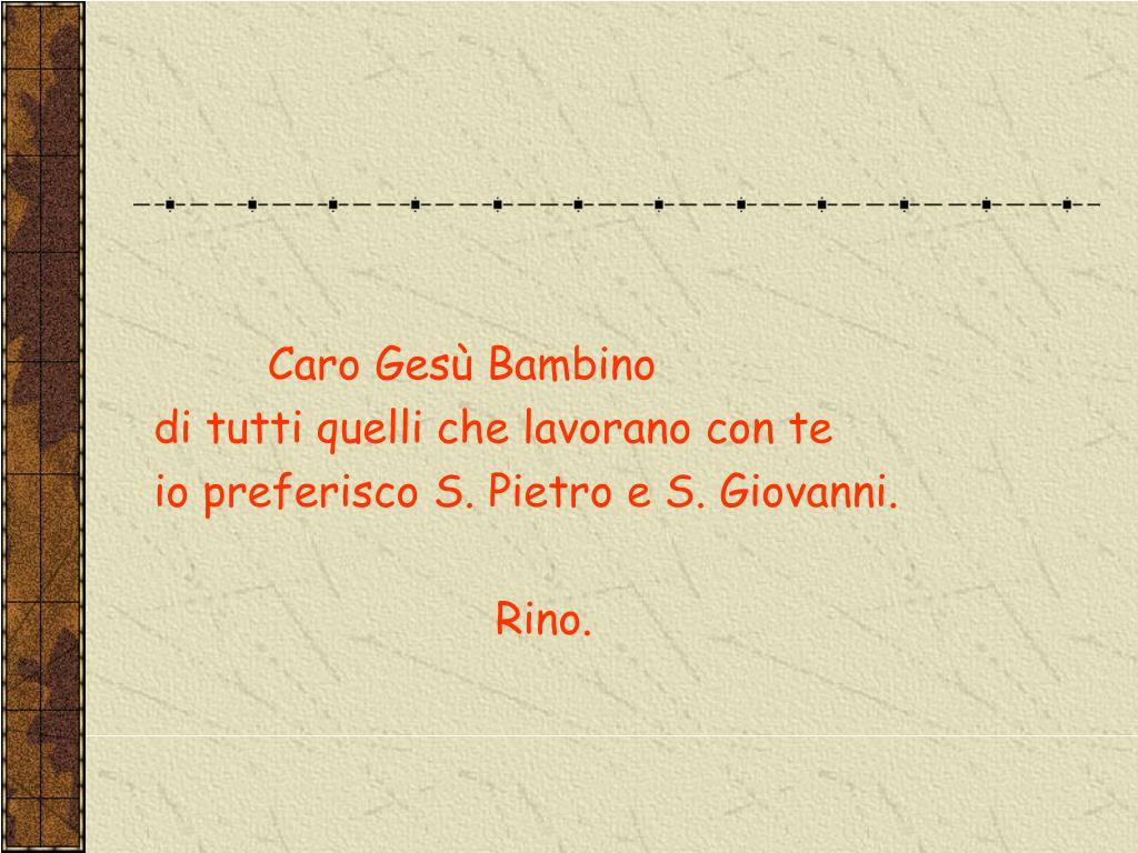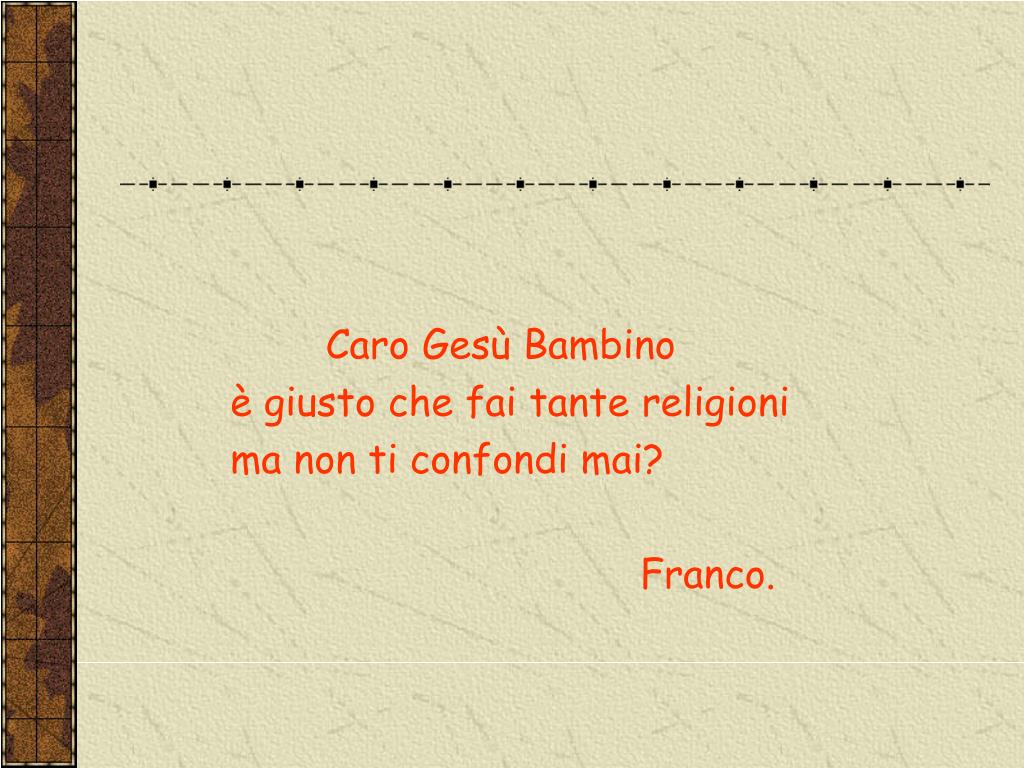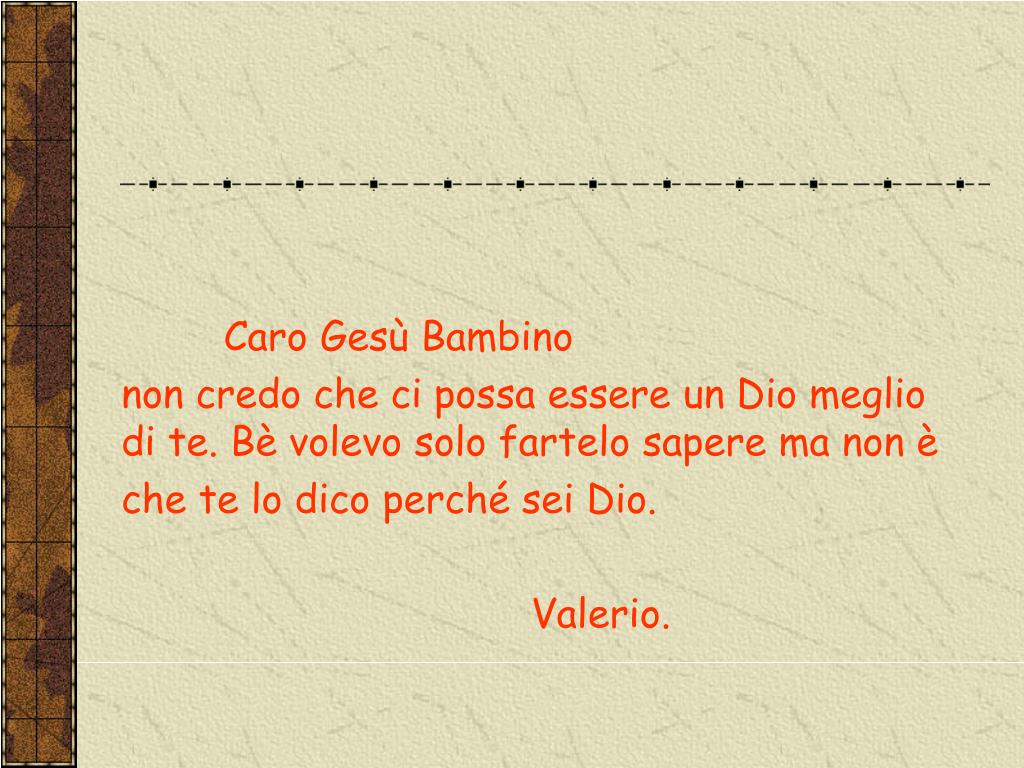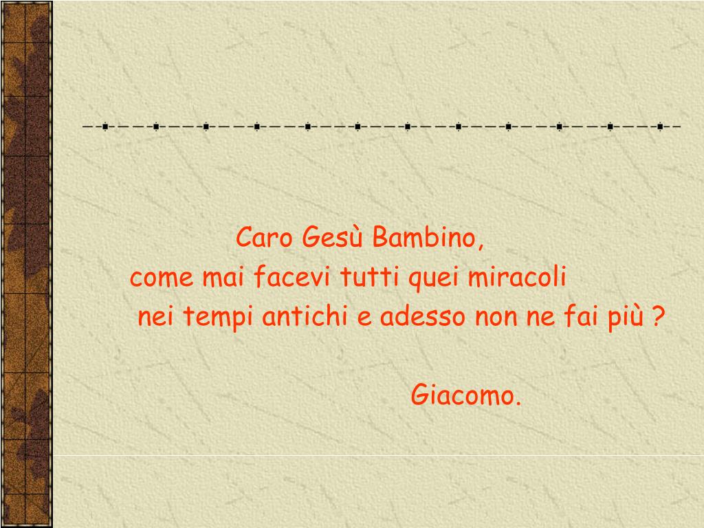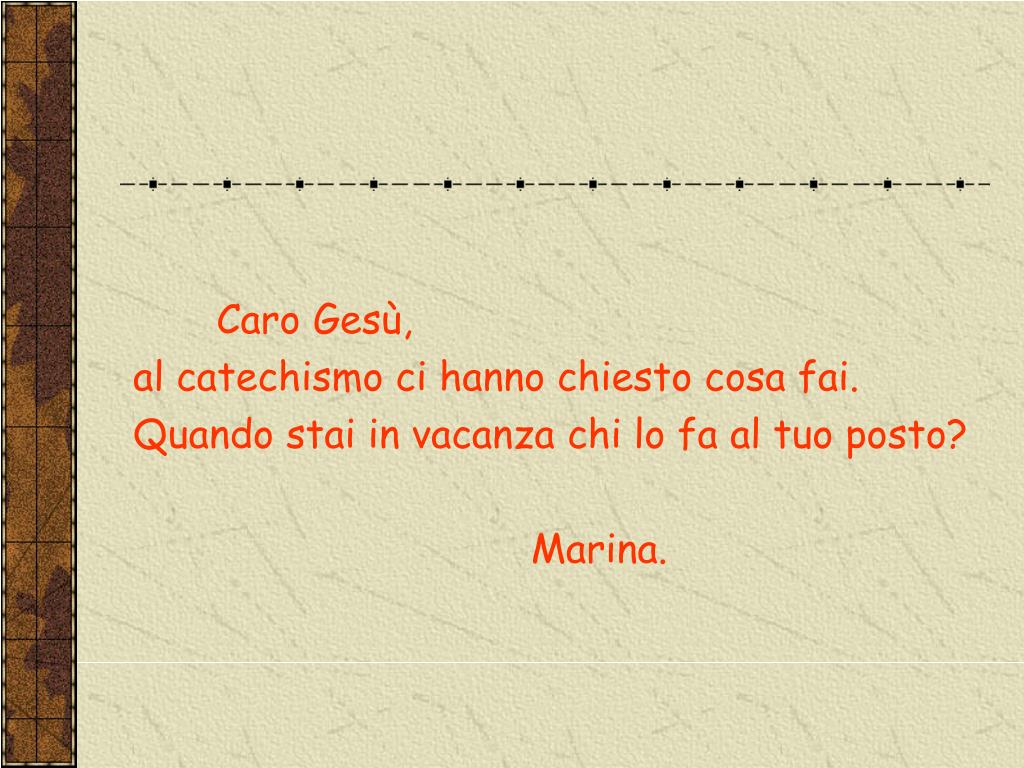 LETTERE DEI BAMBINI A GESU’. Caro Gesù, al catechismo ci hanno chiesto cosa fai. Quando stai in vacanza chi lo fa al tuo posto? Marina. Caro Gesù, a carnevale mi travestirò da diavolo, ciai niente in contrario ? Michela. Caro Gesù Bambino