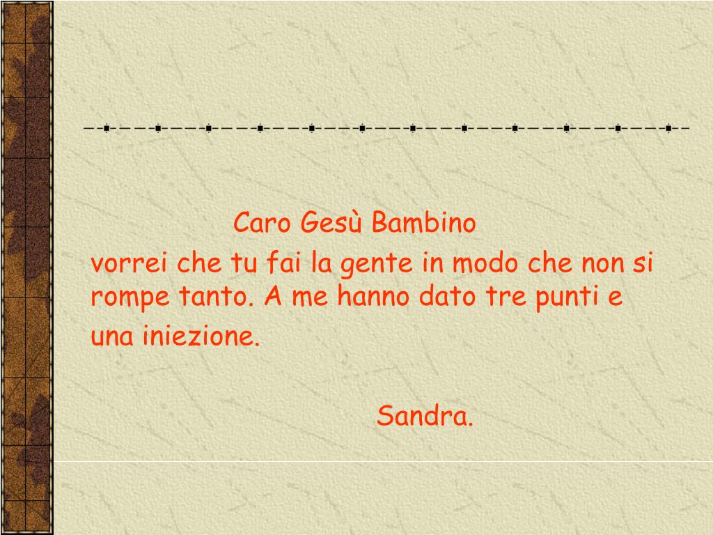 Caro Gesù Bambino vorrei che tu fai la gente in modo che non si rompe tanto. A me hanno dato tre punti e una iniezione. Sandra.