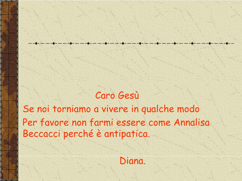 Caro Gesù Se noi torniamo a vivere in qualche modo Per favore non farmi essere come Annalisa Beccacci perché è antipatica. Diana.