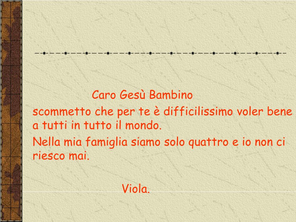 Caro Gesù Bambino scommetto che per te è difficilissimo voler bene a tutti in tutto il mondo. Nella mia famiglia siamo solo quattro e io non ci riesco mai. Viola.