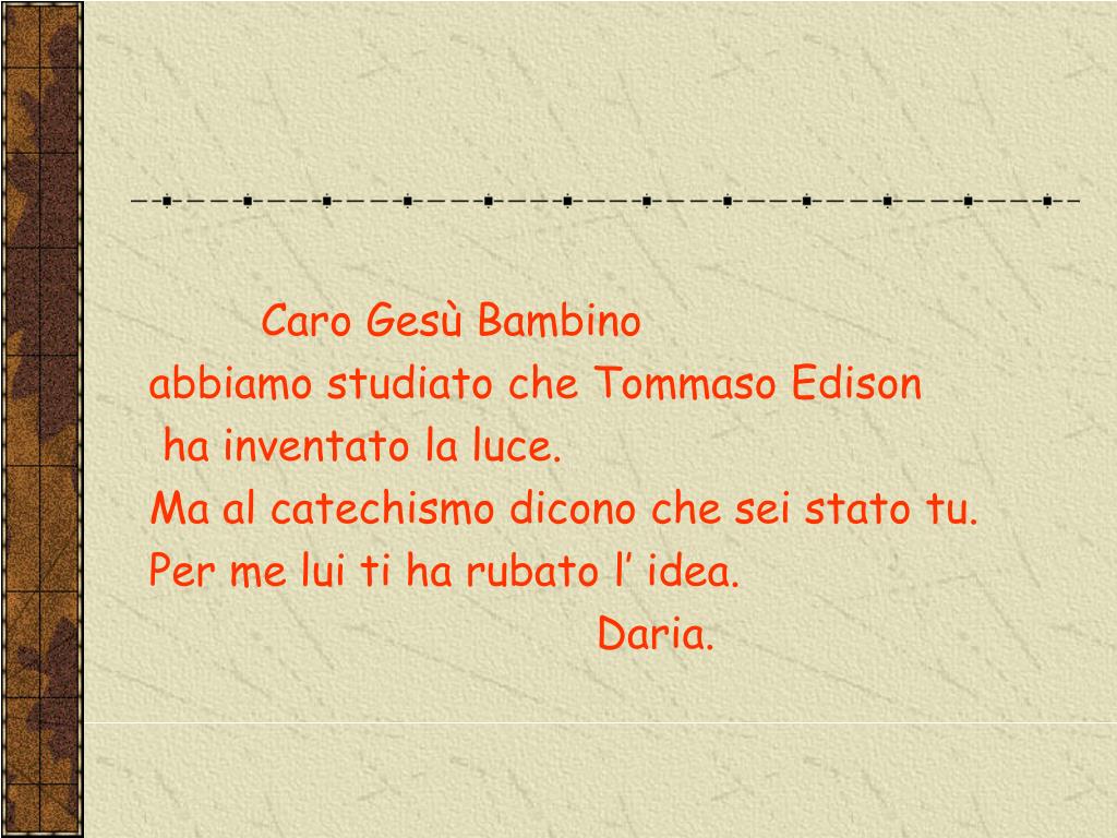 Caro Gesù Bambino abbiamo studiato che Tommaso Edison ha inventato la luce. Ma al catechismo dicono che sei stato tu. Per me lui ti ha rubato l’ idea. Daria.