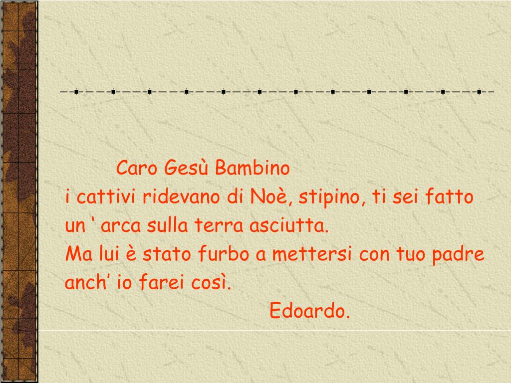 Caro Gesù Bambino i cattivi ridevano di Noè, stipino, ti sei fatto un ‘ arca sulla terra asciutta. Ma lui è stato furbo a mettersi con tuo padre anch’ io farei così. Edoardo.