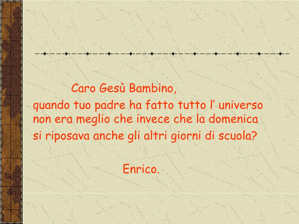Caro Gesù Bambino, quando tuo padre ha fatto tutto l’ universo non era meglio che invece che la domenica si riposava anche gli altri giorni di scuola? Enrico.