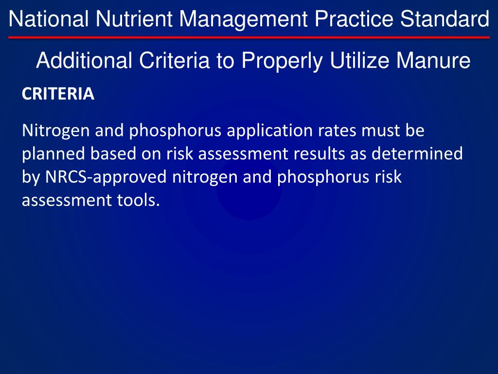 National Nutrient Management Practice Standard Additional Criteria to Properly Utilize Manure Criteria Nitrogen and phosphorus application rates must be planned based on risk assessment results as determined by NRCS-approved nitrogen and phosphorus risk assessment tools.