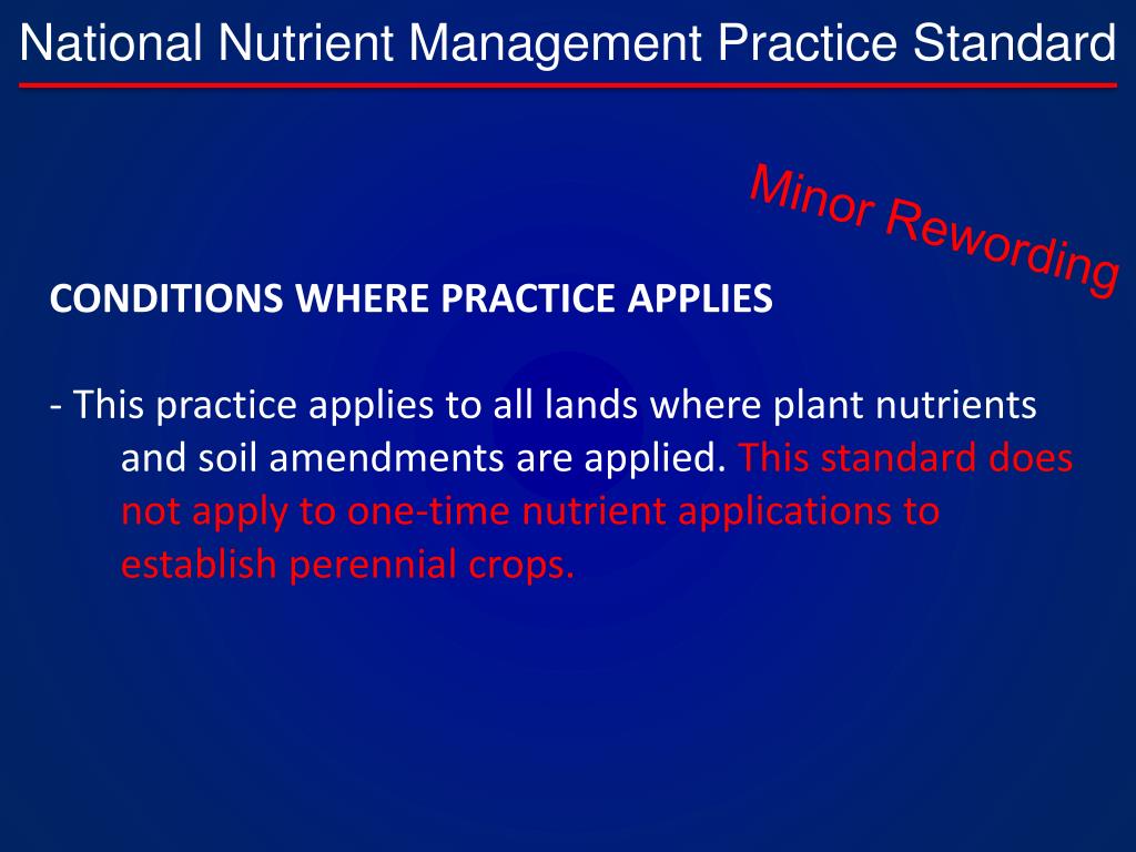 National Nutrient Management Practice Standard Minor Rewording • CONDITIONS WHERE PRACTICE APPLIES • - This practice applies to all lands where plant nutrients and soil amendments are applied. This standard does not apply to one-time nutrient applications to establish perennial crops.