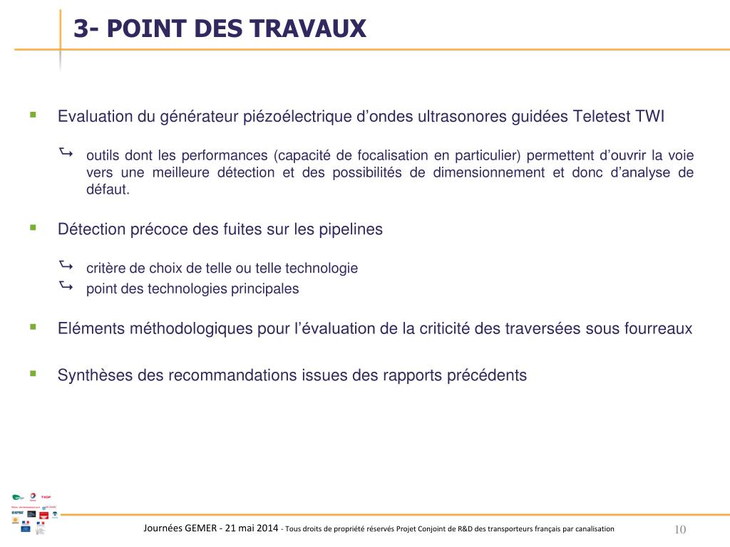 3- POINT DES TRAVAUX • Evaluation du générateur piézoélectrique d’ondes ultrasonores guidées Teletest TWI • outils dont les performances (capacité de focalisation en particulier) permettent d’ouvrir la voie vers une meilleure détection et des possibilités de dimensionnement et donc d’analyse de défaut. • Détection précoce des fuites sur les pipelines • critère de choix de telle ou telle technologie • point des technologies principales • Eléments méthodologiques pour l’évaluation de la criticité des traversées sous fourreaux • Synthèses des recommandations issues des rapports précédents