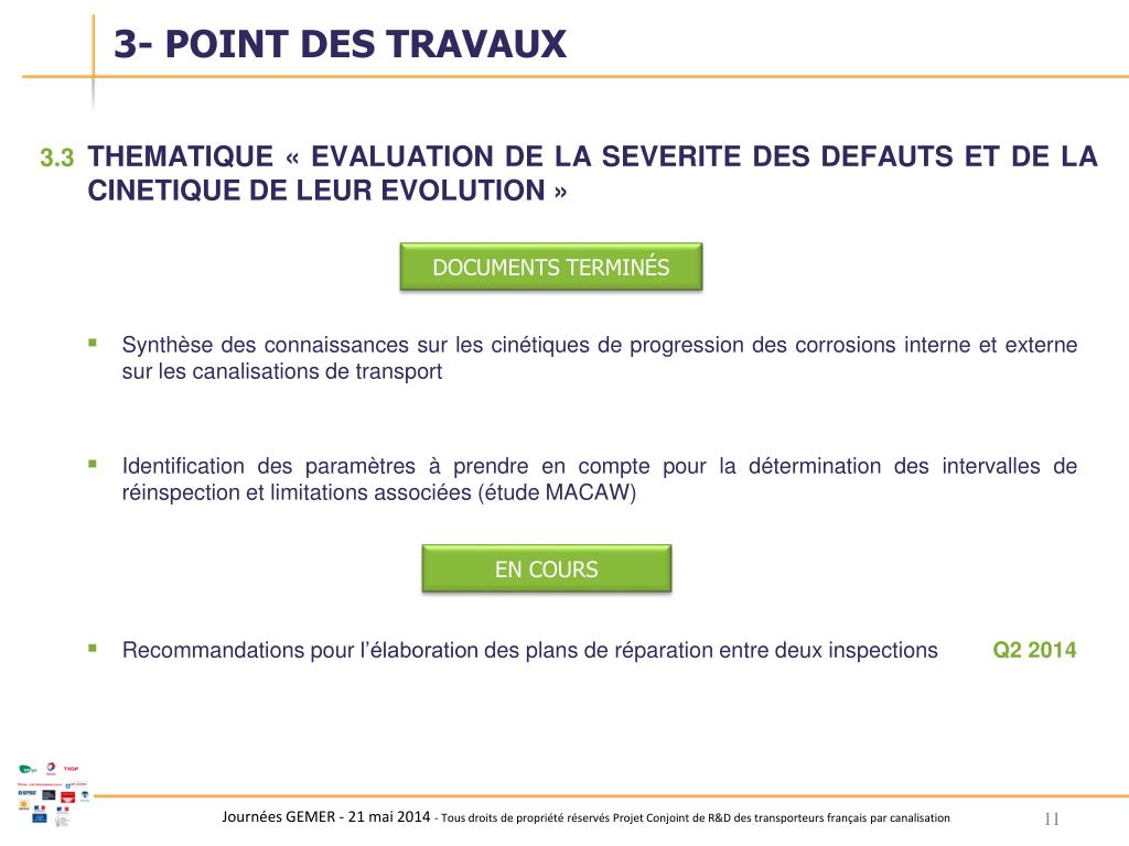 3- POINT DES TRAVAUX • 3.3THEMATIQUE « EVALUATION DE LA SEVERITE DES DEFAUTS ET DE LA CINETIQUE DE LEUR EVOLUTION » DOCUMENTS TERMINÉS • Synthèse des connaissances sur les cinétiques de progression des corrosions interne et externe sur les canalisations de transport • Identification des paramètres à prendre en compte pour la détermination des intervalles de réinspection et limitations associées (étude MACAW) • Recommandations pour l’élaboration des plans de réparation entre deux inspections Q2 2014 EN COURS