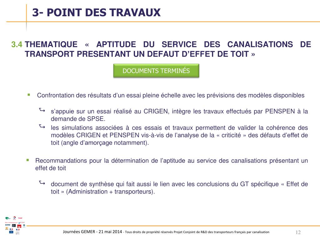 3- POINT DES TRAVAUX • 3.4 THEMATIQUE « APTITUDE DU SERVICE DES CANALISATIONS DE TRANSPORT PRESENTANT UN DEFAUT D’EFFET DE TOIT » DOCUMENTS TERMINÉS • Confrontation des résultats d’un essai pleine échelle avec les prévisions des modèles disponibles • s’appuie sur un essai réalisé au CRIGEN, intègre les travaux effectués par PENSPEN à la demande de SPSE. • les simulations associées à ces essais et travaux permettent de valider la cohérence des modèles CRIGEN et PENSPEN vis-à-vis de l’analyse de la « criticité » des défauts d’effet de toit (angle d’amorçage notamment). • Recommandations pour la détermination de l’aptitude au service des canalisations présentant un effet de toit • document de synthèse qui fait aussi le lien avec les conclusions du GT spécifique « Effet de toit » (Administration + transporteurs).