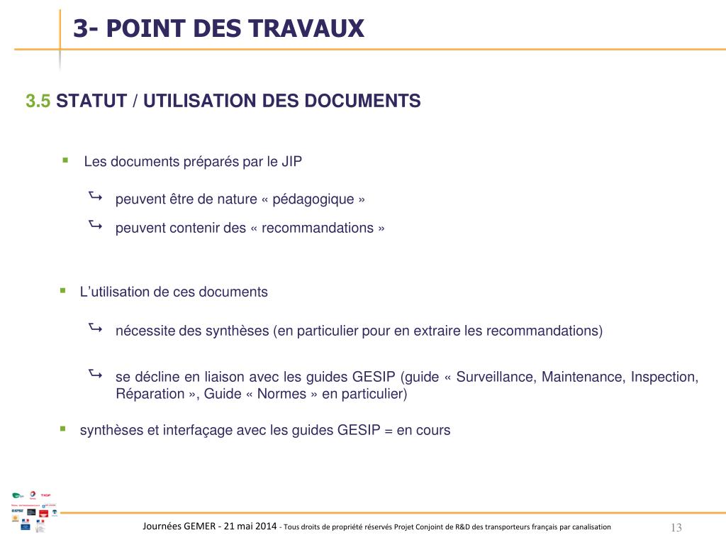 3- POINT DES TRAVAUX • 3.5STATUT / UTILISATION DES DOCUMENTS • Les documents préparés par le JIP • peuvent être de nature « pédagogique » • peuvent contenir des « recommandations » • L’utilisation de ces documents • nécessite des synthèses (en particulier pour en extraire les recommandations) • se décline en liaison avec les guides GESIP (guide « Surveillance, Maintenance, Inspection, Réparation », Guide « Normes » en particulier) • synthèses et interfaçage avec les guides GESIP = en cours