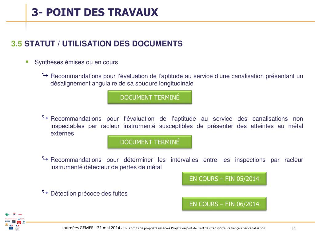 3- POINT DES TRAVAUX • 3.5STATUT / UTILISATION DES DOCUMENTS • Synthèses émises ou en cours • Recommandations pour l’évaluation de l’aptitude au service d’une canalisation présentant un désalignement angulaire de sa soudure longitudinale • Recommandations pour l’évaluation de l’aptitude au service des canalisations non inspectables par racleur instrumenté susceptibles de présenter des atteintes au métal externes • Recommandations pour déterminer les intervalles entre les inspections par racleur instrumenté détecteur de pertes de métal • Détection précoce des fuites DOCUMENT TERMINÉ DOCUMENT TERMINÉ EN COURS – FIN 05/2014 EN COURS – FIN 06/2014