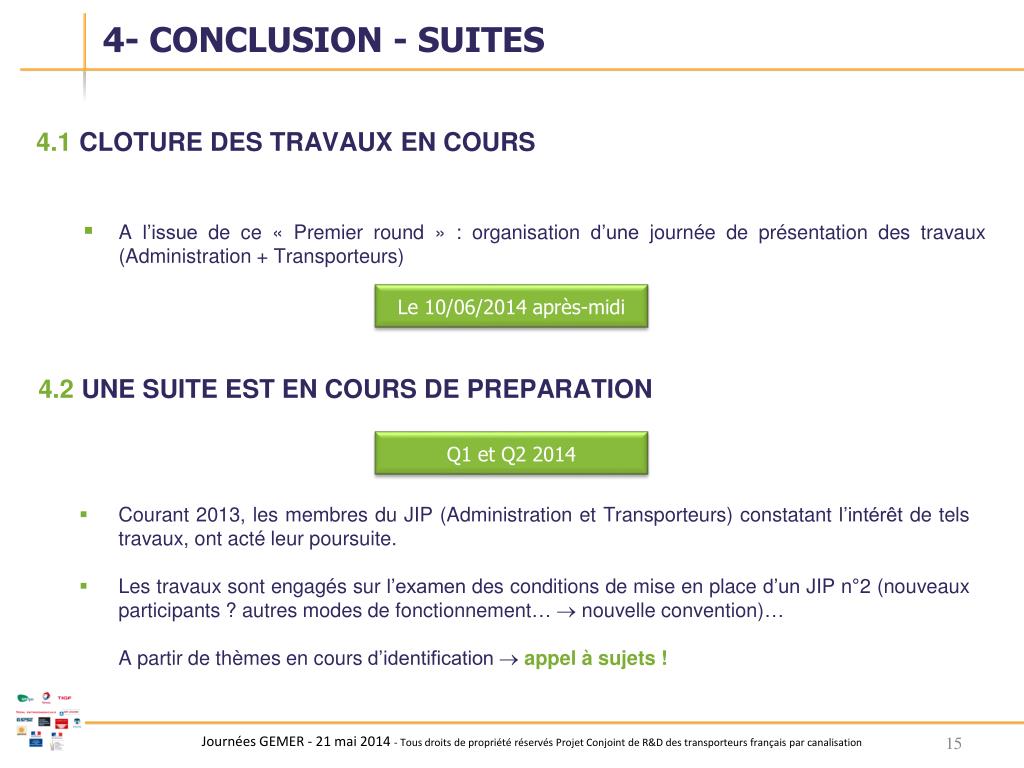 4- CONCLUSION - SUITES • 4.1 CLOTURE DES TRAVAUX EN COURS • A l’issue de ce « Premier round » : organisation d’une journée de présentation des travaux (Administration + Transporteurs) Le 10/06/2014 après-midi • 4.2 UNE SUITE EST EN COURS DE PREPARATION • Courant 2013, les membres du JIP (Administration et Transporteurs) constatant l’intérêt de tels travaux, ont acté leur poursuite. • Les travaux sont engagés sur l’examen des conditions de mise en place d’un JIP n°2 (nouveaux participants ? autres modes de fonctionnement… nouvelle convention)… • A partir de thèmes en cours d’identification appel à sujets ! Q1 et Q2 2014