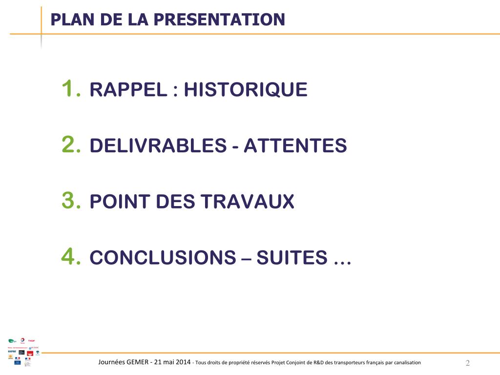 PLAN DE LA PRESENTATION RAPPEL : HISTORIQUE DELIVRABLES - ATTENTES POINT DES TRAVAUX CONCLUSIONS – SUITES …