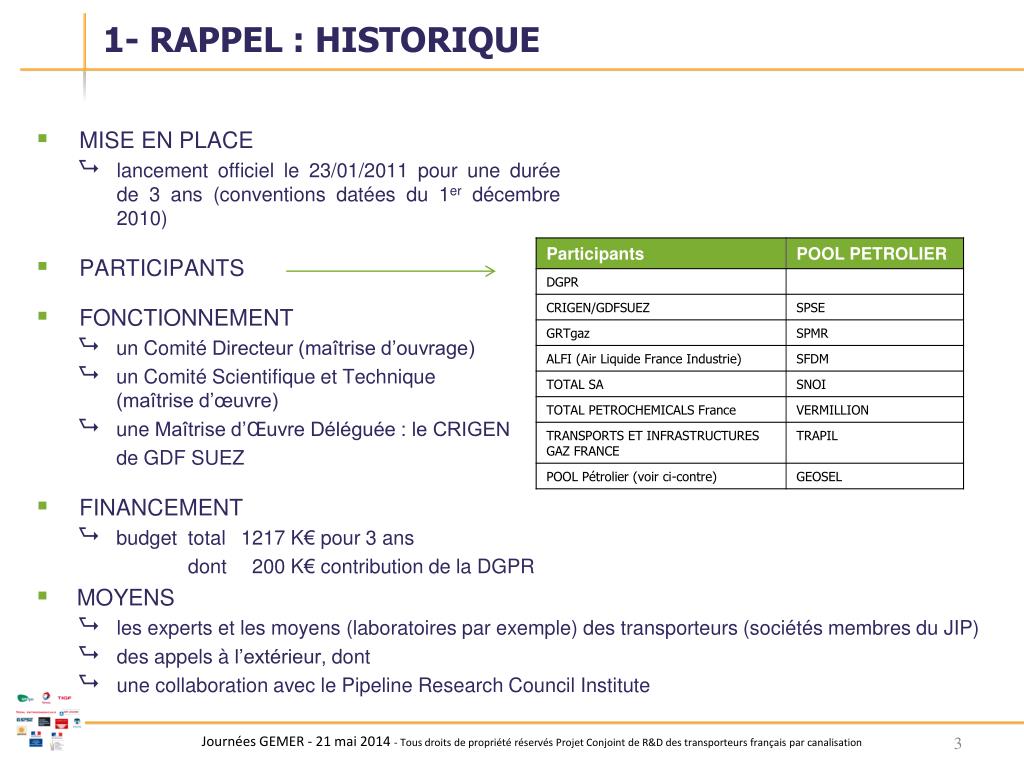 1- RAPPEL : HISTORIQUE • FONCTIONNEMENT • un ComitéDirecteur (maîtrise d’ouvrage) • un Comité Scientifique et Technique (maîtrise d’œuvre) • une Maîtrise d’Œuvre Déléguée : le CRIGEN • de GDF SUEZ • FINANCEMENT • budget total 1217 K€ pour 3 ans • dont 200 K€ contribution de la DGPR • MOYENS • les experts et les moyens (laboratoires par exemple) des transporteurs (sociétés membres du JIP) • des appels à l’extérieur, dont • une collaboration avec le Pipeline Research Council Institute • MISE EN PLACE • lancement officiel le 23/01/2011 pour une durée de 3 ans (conventions datées du 1er décembre 2010) • PARTICIPANTS