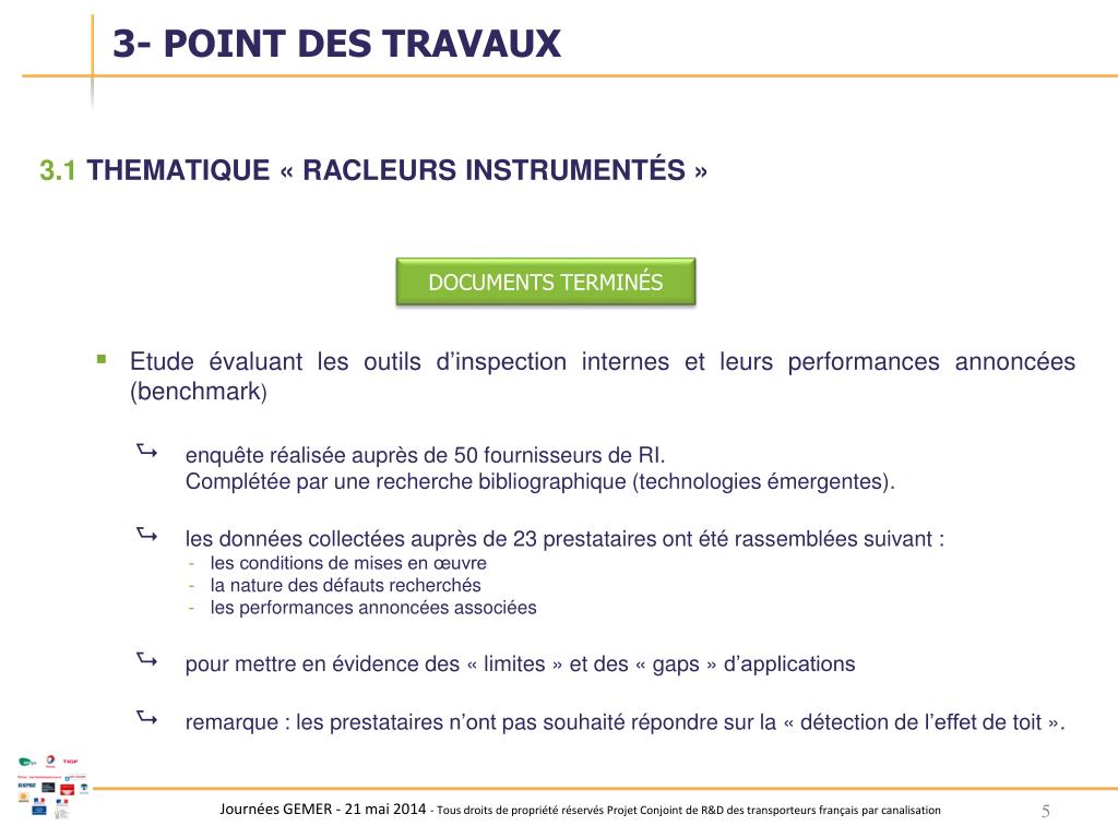 3- POINT DES TRAVAUX • 3.1 THEMATIQUE « RACLEURS INSTRUMENTÉS » DOCUMENTS TERMINÉS • Etude évaluant les outils d’inspection internes et leurs performances annoncées (benchmark) • enquête réalisée auprès de 50 fournisseurs de RI. • Complétée par une recherche bibliographique (technologies émergentes). • les données collectées auprès de 23 prestataires ont été rassemblées suivant : • les conditions de mises en œuvre • la nature des défauts recherchés • les performances annoncées associées • pour mettre en évidence des « limites » et des « gaps » d’applications • remarque : les prestataires n’ont pas souhaité répondre sur la « détection de l’effet de toit ».