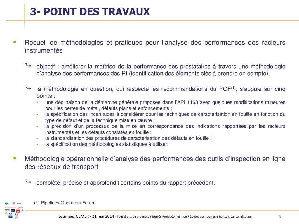 3- POINT DES TRAVAUX • Recueil de méthodologies et pratiques pour l’analyse des performances des racleurs instrumentés • objectif : améliorer la maîtrise de la performance des prestataires à travers une méthodologie d’analyse des performances des RI (identification des éléments clés à prendre en compte). • la méthodologie en question, qui respecte les recommandations du POF(1), s’appuie sur cinq points : • une déclinaison de la démarche générale proposée dans l’API 1163 avec quelques modifications mineures pour les pertes de métal, défauts plans et enfoncements ; • la spécification des incertitudes à considérer pour les techniques de caractérisation en fouille en fonction du type de défaut et de la technique mise en œuvre ; • la précision d’un processus de la mise en correspondance des indications rapportées par les racleurs instrumentés et les défauts constatés en fouille ; • la standardisation des procédures de caractérisation des défauts en fouille ; • la spécification des méthodologies statistiques à utiliser. • Méthodologie opérationnelle d’analyse des performances des outils d’inspection en ligne des réseaux de transport • complète, précise et approfondit certains points du rapport précédent. • (1) Pipelines Operators Forum