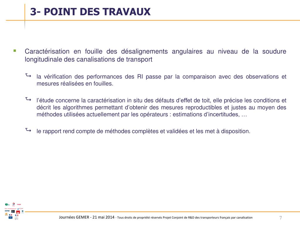 3- POINT DES TRAVAUX • Caractérisation en fouille des désalignements angulaires au niveau de la soudure longitudinale des canalisations de transport • la vérification des performances des RI passe par la comparaison avec des observations et mesures réalisées en fouilles. • l’étude concerne la caractérisation in situ des défauts d’effet de toit, elle précise les conditions et décrit les algorithmes permettant d’obtenir des mesures reproductibles et justes au moyen des méthodes utilisées actuellement par les opérateurs : estimations d’incertitudes, … • le rapport rend compte de méthodes complètes et validées et les met à disposition.