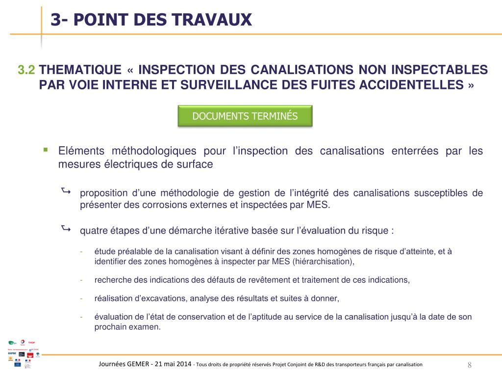 3- POINT DES TRAVAUX • 3.2THEMATIQUE « INSPECTION DES CANALISATIONS NON INSPECTABLES PAR VOIE INTERNE ET SURVEILLANCE DES FUITES ACCIDENTELLES » DOCUMENTS TERMINÉS • Eléments méthodologiques pour l’inspection des canalisations enterrées par les mesures électriques de surface • proposition d’une méthodologie de gestion de l’intégrité des canalisations susceptibles de présenter des corrosions externes et inspectées par MES. • quatre étapes d’une démarche itérative basée sur l’évaluation du risque : • étude préalable de la canalisation visant à définir des zones homogènes de risque d’atteinte, et à identifier des zones homogènes à inspecter par MES (hiérarchisation), • recherche des indications des défauts de revêtement et traitement de ces indications, • réalisation d’excavations, analyse des résultats et suites à donner, • évaluation de l’état de conservation et de l’aptitude au service de la canalisation jusqu’à la date de son prochain examen.