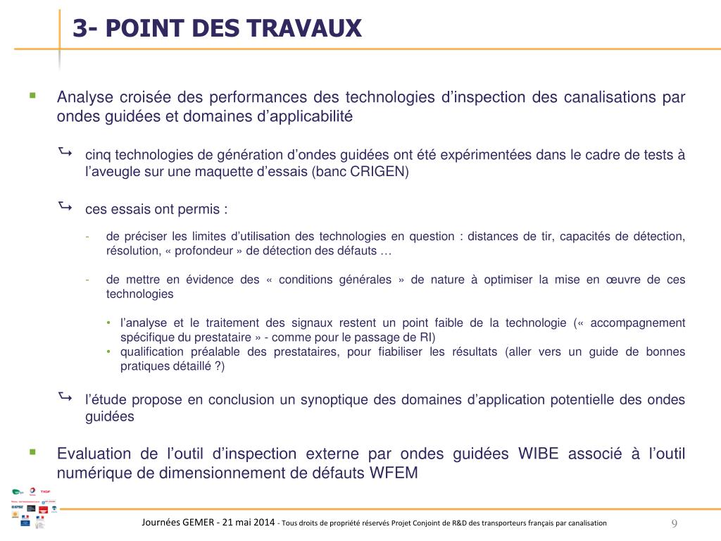 3- POINT DES TRAVAUX • Analyse croisée des performances des technologies d’inspection des canalisations par ondes guidées et domaines d’applicabilité • cinq technologies de génération d’ondes guidées ont été expérimentées dans le cadre de tests à l’aveugle sur une maquette d’essais (banc CRIGEN) • ces essais ont permis : • de préciser les limites d’utilisation des technologies en question : distances de tir, capacités de détection, résolution, « profondeur » de détection des défauts … • de mettre en évidence des « conditions générales » de nature à optimiser la mise en œuvre de ces technologies • l’analyse et le traitement des signaux restent un point faible de la technologie (« accompagnement spécifique du prestataire » - comme pour le passage de RI) • qualification préalable des prestataires, pour fiabiliser les résultats (aller vers un guide de bonnes pratiques détaillé ?) • l’étude propose en conclusion un synoptique des domaines d’application potentielle des ondes guidées • Evaluation de l’outil d’inspection externe par ondes guidées WIBE associé à l’outil numérique de dimensionnement de défauts WFEM