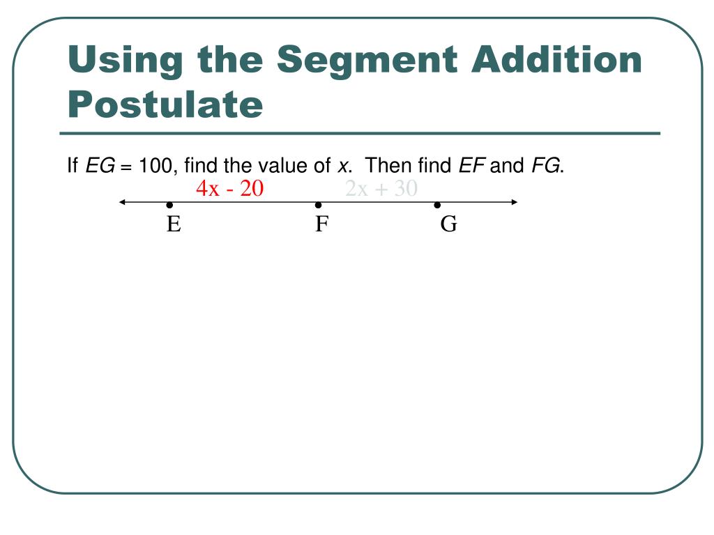 Using the Segment Addition Postulate If EG = 100, find the value of x. Then find EF and FG. 4x - 20 2x + 30 E F G