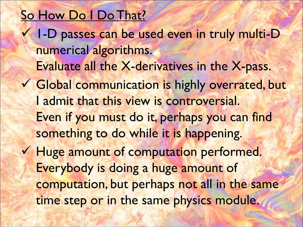 So How Do I Do That? • 1-D passes can be used even in truly multi-D numerical algorithms.Evaluate all the X-derivatives in the X-pass. • Global communication is highly overrated, but I admit that this view is controversial.Even if you must do it, perhaps you can find something to do while it is happening. • Huge amount of computation performed.Everybody is doing a huge amount of computation, but perhaps not all in the same time step or in the same physics module.
