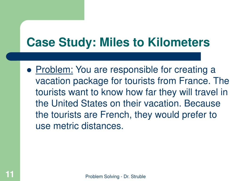Case Study: Miles to Kilometers • Problem: You are responsible for creating a vacation package for tourists from France. The tourists want to know how far they will travel in the United States on their vacation. Because the tourists are French, they would prefer to use metric distances. Problem Solving - Dr. Struble