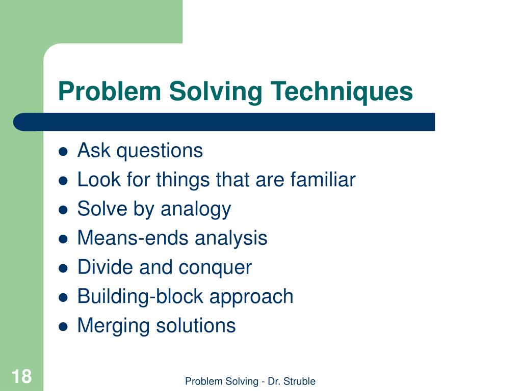 Problem Solving Techniques • Ask questions • Look for things that are familiar • Solve by analogy • Means-ends analysis • Divide and conquer • Building-block approach • Merging solutions Problem Solving - Dr. Struble