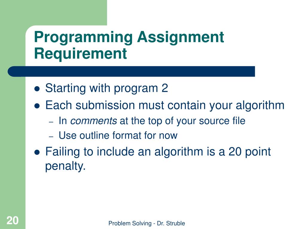 Programming Assignment Requirement • Starting with program 2 • Each submission must contain your algorithm • In comments at the top of your source file • Use outline format for now • Failing to include an algorithm is a 20 point penalty. Problem Solving - Dr. Struble