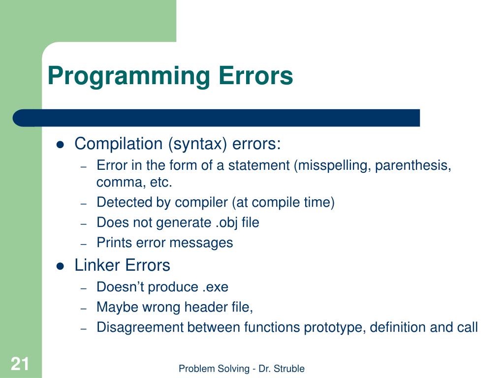Programming Errors • Compilation (syntax) errors: • Error in the form of a statement (misspelling, parenthesis, comma, etc. • Detected by compiler (at compile time) • Does not generate .obj file • Prints error messages • Linker Errors • Doesn’t produce .exe • Maybe wrong header file, • Disagreement between functions prototype, definition and call Problem Solving - Dr. Struble