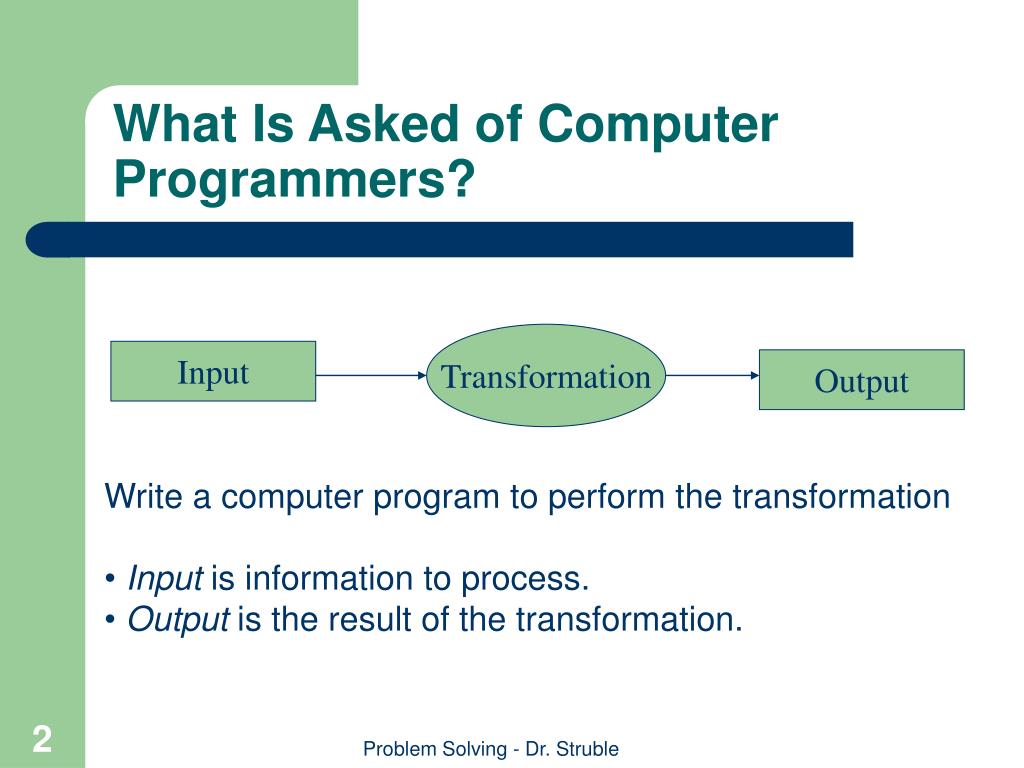 What Is Asked of Computer Programmers? Transformation Input Output • Write a computer program to perform the transformation • Input is information to process. • Output is the result of the transformation. Problem Solving - Dr. Struble