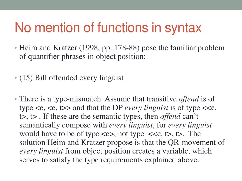 No mention of functions in syntax • Heim and Kratzer (1998, pp. 178-88) pose the familiar problem of quantifier phrases in object position: • (15) Bill offended every linguist • There is a type-mismatch. Assume that transitive offend is of type <e, <e, t>> and that the DP every linguist is of type <<e, t>, t> . If these are the semantic types, then offend can’t semantically compose with every linguist, for every linguist would have to be of type <e>, not type <<e, t>, t>. The solution Heim and Kratzer propose is that the QR-movement of every linguist from object position creates a variable, which serves to satisfy the type requirements explained above.