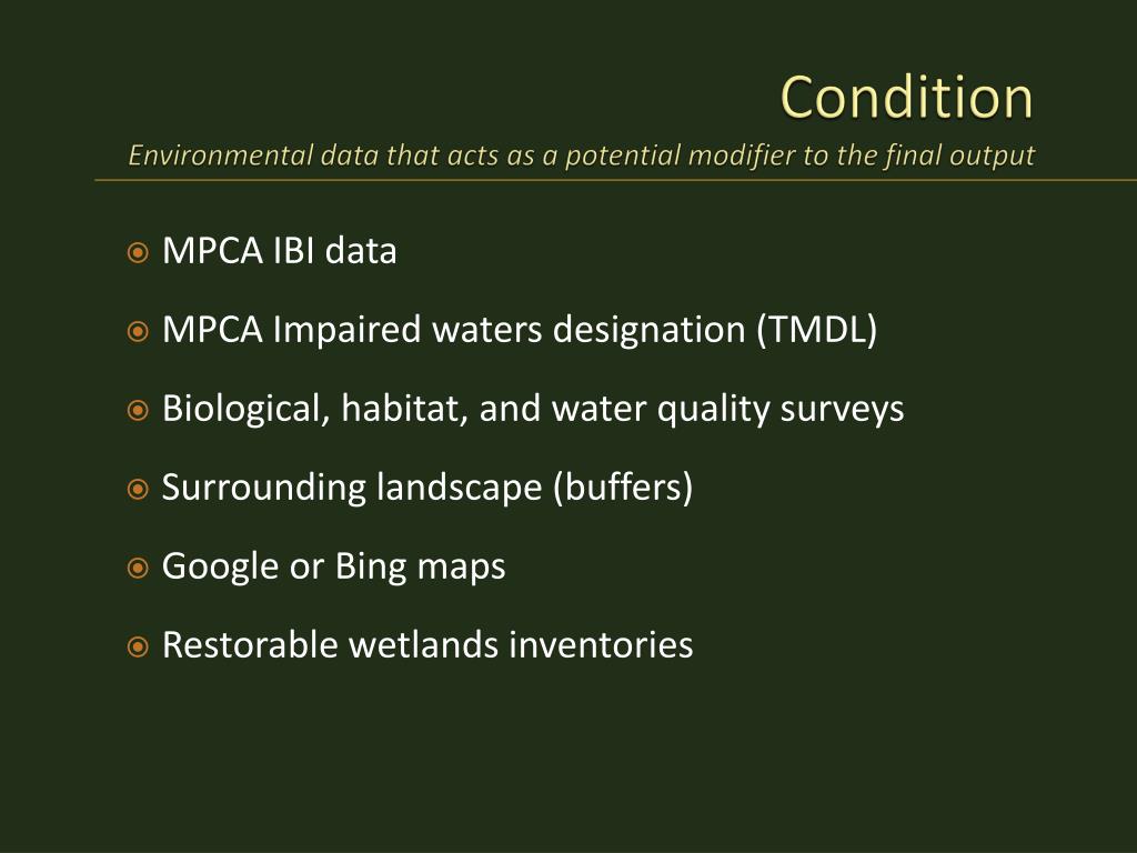 ConditionEnvironmental data that acts as a potential modifier to the final output • MPCA IBI data • MPCA Impaired waters designation (TMDL) • Biological, habitat, and water quality surveys • Surrounding landscape (buffers) • Google or Bing maps • Restorable wetlands inventories