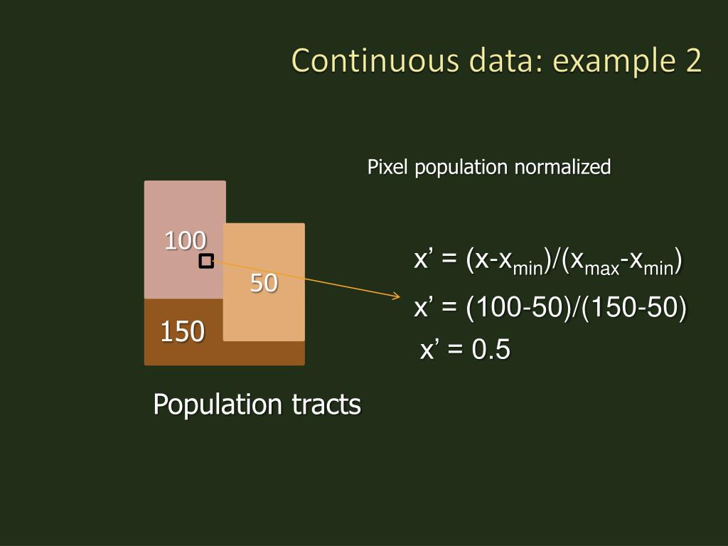 Continuous data: example 2 Pixel population normalized 100 50 x’ = (x-xmin)/(xmax-xmin) x’ = (100-50)/(150-50) 150 x’ = 0.5 Population tracts