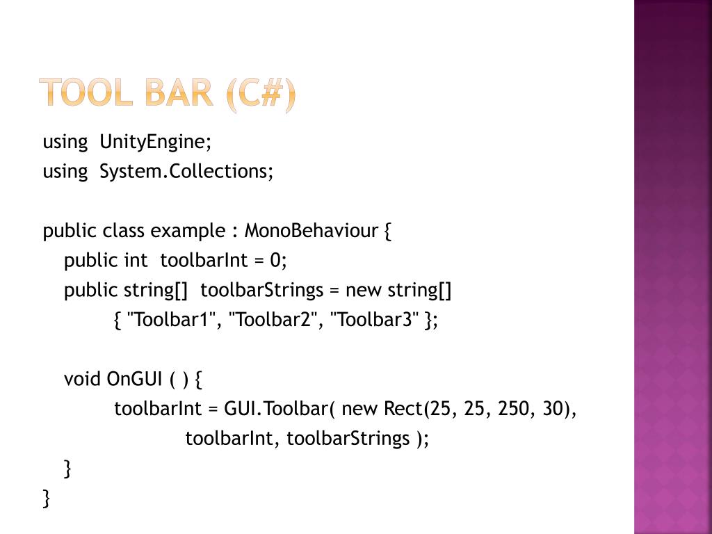 Tool bar (C#) using UnityEngine; using System.Collections; public class example : MonoBehaviour { public int toolbarInt = 0; public string[] toolbarStrings = new string[] { "Toolbar1", "Toolbar2", "Toolbar3" }; void OnGUI ( ) { toolbarInt = GUI.Toolbar( new Rect(25, 25, 250, 30), toolbarInt, toolbarStrings ); } }
