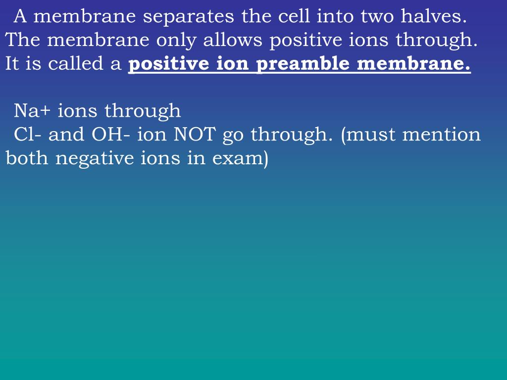 A membrane separates the cell into two halves. The membrane only allows positive ions through. It is called a positive ion preamble membrane. Na+ ions through Cl- and OH- ion NOT go through. (must mention both negative ions in exam)