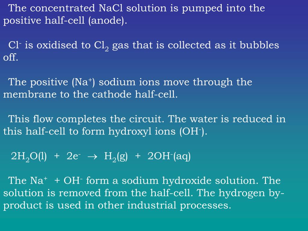 The concentrated NaCl solution is pumped into the positive half-cell (anode). • Cl- is oxidised to Cl2 gas that is collected as it bubbles off. • The positive (Na+) sodium ions move through the membrane to the cathode half-cell. • This flow completes the circuit. The water is reduced in this half-cell to form hydroxyl ions (OH-). • 2H2O(l) + 2e-H2(g) + 2OH-(aq) • The Na+ + OH- form a sodium hydroxide solution. The solution is removed from the half-cell. The hydrogen by-product is used in other industrial processes.