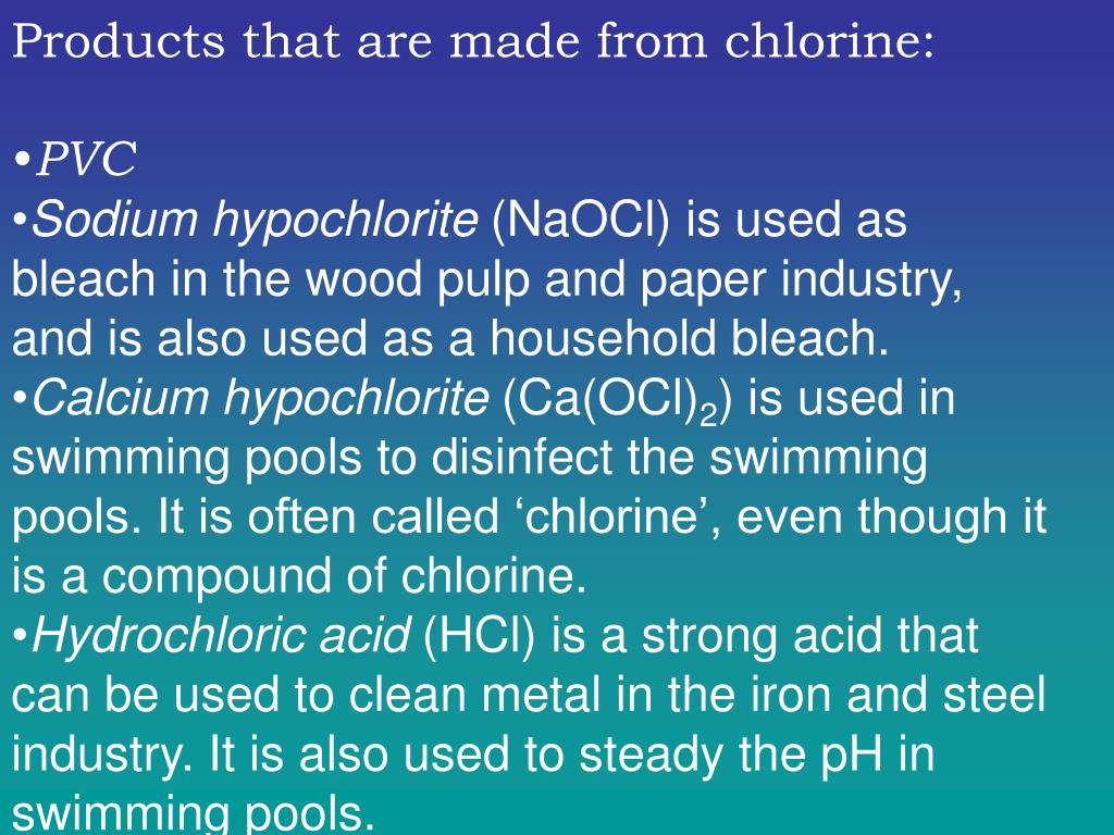 Products that are made from chlorine: • PVC • Sodium hypochlorite (NaOCl) is used as bleach in the wood pulp and paper industry, and is also used as a household bleach. • Calcium hypochlorite (Ca(OCl)2) is used in swimming pools to disinfect the swimming pools. It is often called ‘chlorine’, even though it is a compound of chlorine. • Hydrochloric acid (HCl) is a strong acid that can be used to clean metal in the iron and steel industry. It is also used to steady the pH in swimming pools.