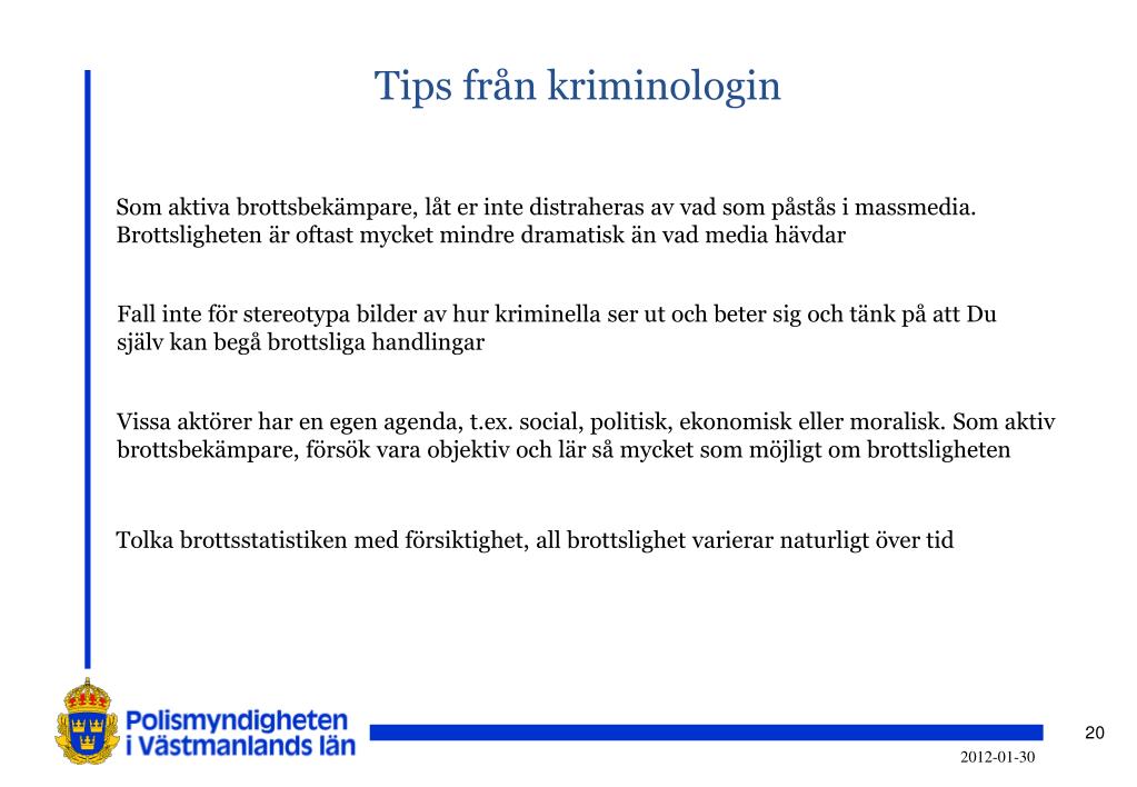 Tips från kriminologin Som aktiva brottsbekämpare, låt er inte distraheras av vad som påstås i massmedia. Brottsligheten är oftast mycket mindre dramatisk än vad media hävdar Fall inte för stereotypa bilder av hur kriminella ser ut och beter sig och tänk på att Du själv kan begå brottsliga handlingar Vissa aktörer har en egen agenda, t.ex. social, politisk, ekonomisk eller moralisk. Som aktiv brottsbekämpare, försök vara objektiv och lär så mycket som möjligt om brottsligheten Tolka brottsstatistiken med försiktighet, all brottslighet varierar naturligt över tid 2012-01-30
