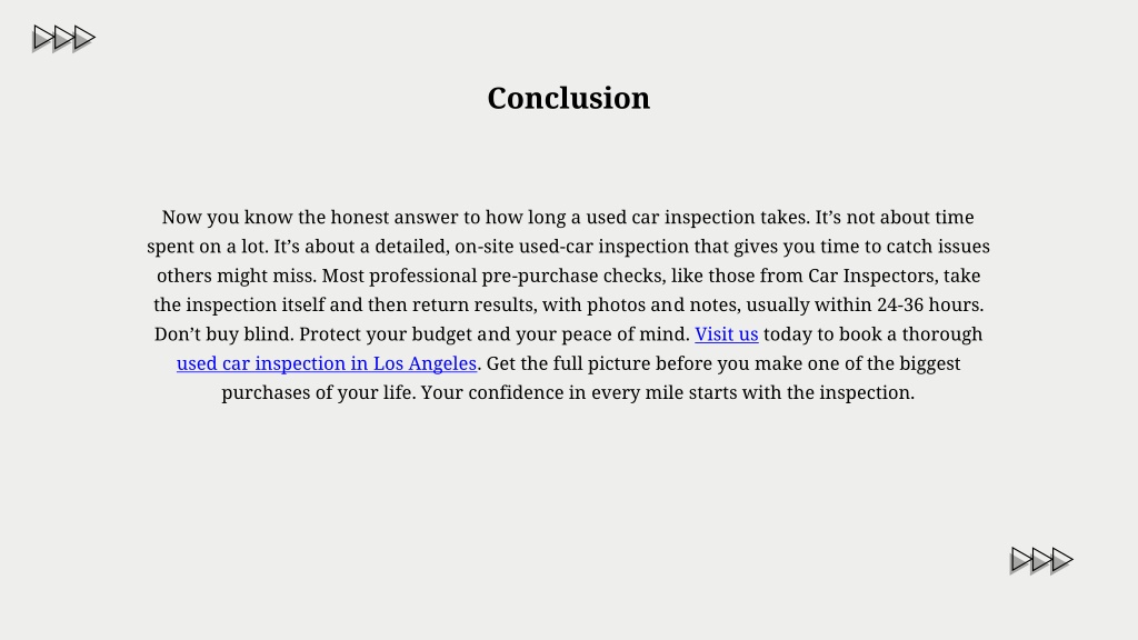Check out this presentation to understand how long a used car inspection really takes and what happens during a professional on-site inspection. It explains the factors that affect inspection time, what inspectors check, and why taking the right amount of time can help you avoid costly surprises.