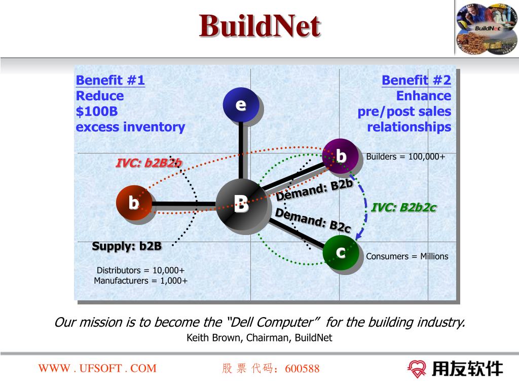 e b IVC: b2B2b B b Demand: B2b IVC: B2b2c Demand: B2c Supply: b2B c BuildNet Benefit #1 Reduce $100B excess inventory Benefit #2 Enhance pre/post sales relationships Builders = 100,000+ Consumers = Millions Distributors = 10,000+ Manufacturers = 1,000+ Our mission is to become the “Dell Computer” for the building industry. Keith Brown, Chairman, BuildNet