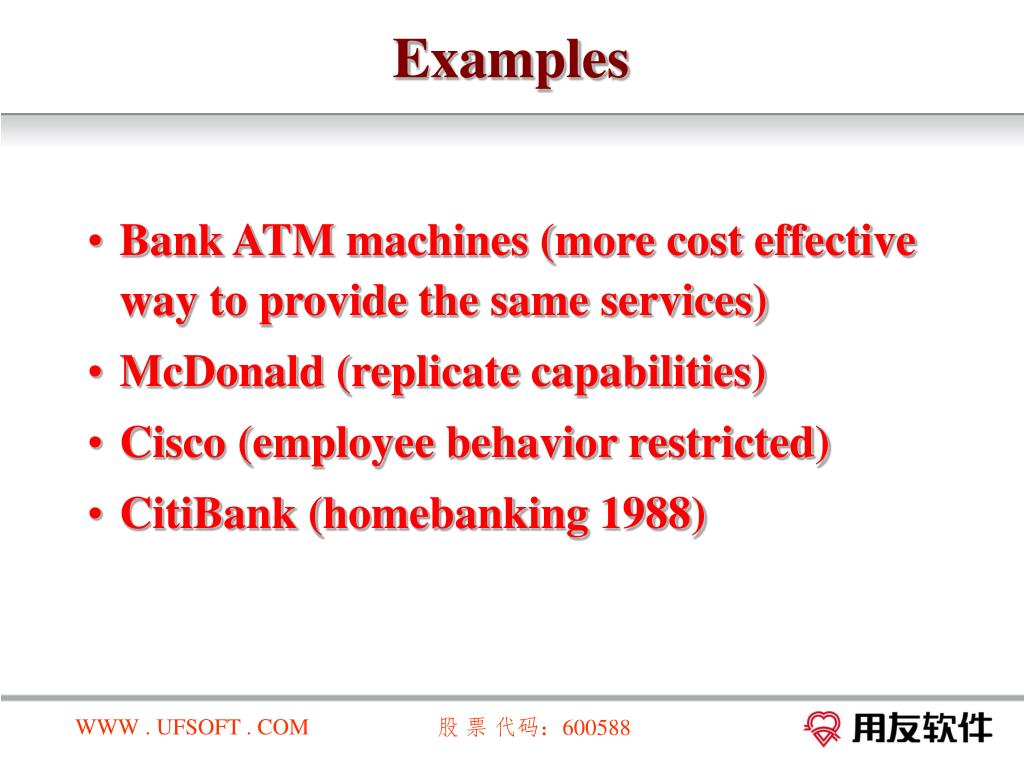 McDonald (replicate capabilities) Cisco (employee behavior restricted) Bank ATM machines (more cost effective way to provide the same services) 波斯登 南京金鹰国际 Examples
