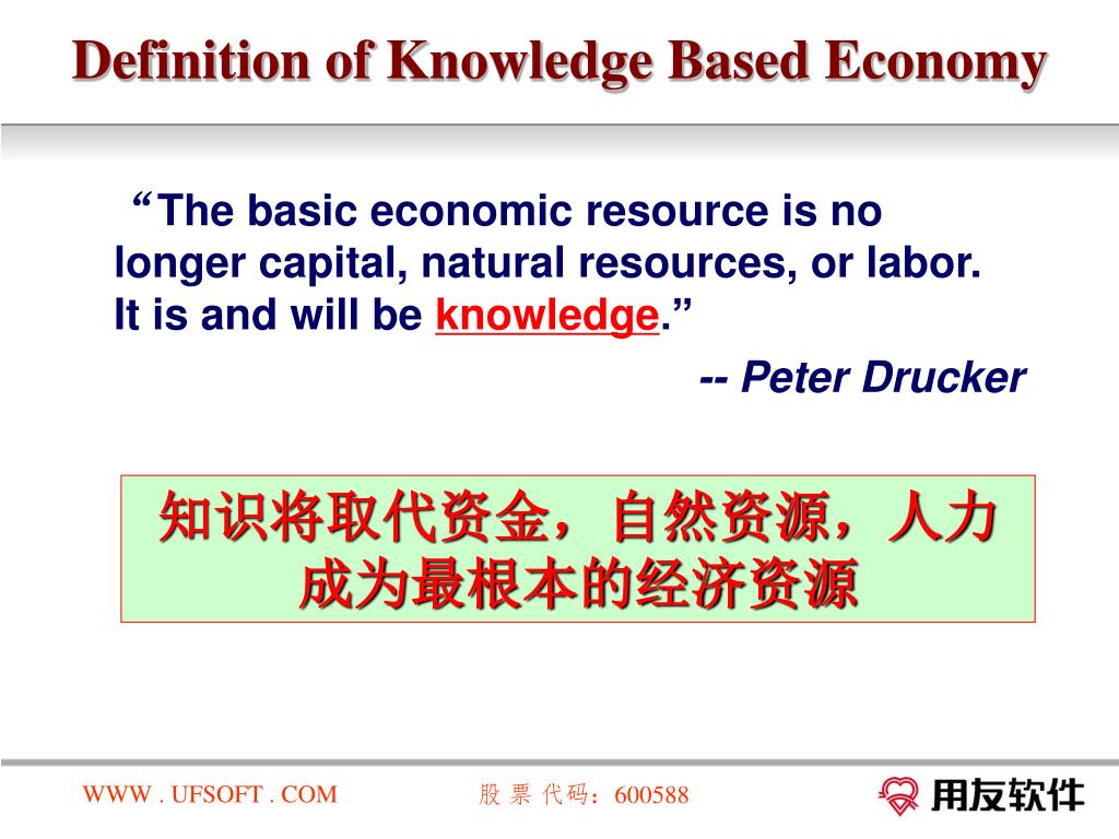 Definition of Knowledge Based Economy “The basic economic resource is no longer capital, natural resources, or labor. It is and will be knowledge.” -- Peter Drucker 知识将取代资金,自然资源,人力 成为最根本的经济资源