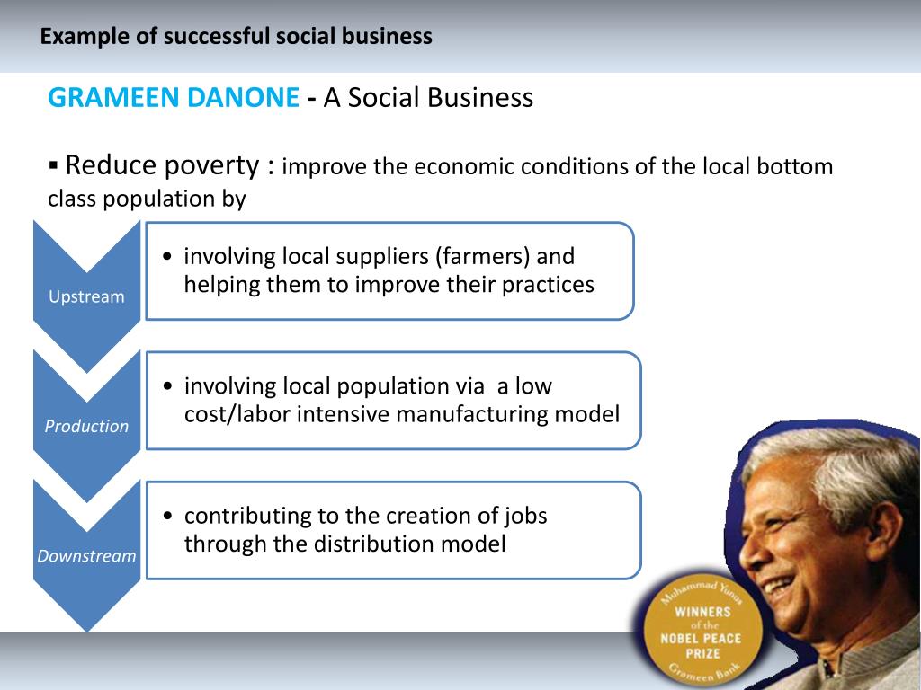 Example of successful social business • GRAMEEN DANONE - A Social Business • Reduce poverty : improve the economic conditions of the local bottom class population by
