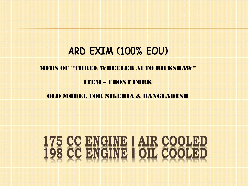 ARD EXIM (100% EOU) MFRS OF “THREE WHEELER AUTO RICKSHAW” ITEM – FRONT FORK OLD MODEL FOR NIGERIA & BANGLADESH. 175 CC ENGINE - AIR COOLED 198 CC ENGINE - OIL COOLED. ARD EXIM – 100% EOU – INDIA www.ardgroup.co.in mail: sales@ardgroup.co.in. ARD EXIM – 100% EOU – INDIA