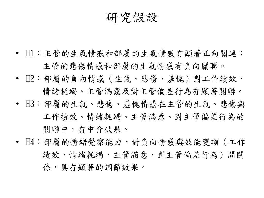 研究假設 • H1:主管的生氣情感和部屬的生氣情感有顯著正向關連; 主管的悲傷情感和部屬的生氣情感有負向關聯。 • H2:部屬的負向情感(生氣、悲傷、羞愧)對工作績效、 情緒耗竭、主管滿意及對主管偏差行為有顯著關聯。 • H3:部屬的生氣、悲傷、羞愧情感在主管的生氣、悲傷與 工作績效、情緒耗竭、主管滿意、對主管偏差行為的 關聯中,有中介效果。 • H4:部屬的情緒覺察能力,對負向情感與效能變項(工作 績效、情緒耗竭、主管滿意、對主管偏差行為)間關 係,具有顯著的調節效果。