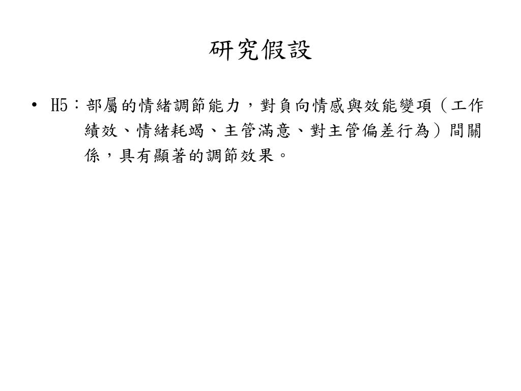 研究假設 • H5:部屬的情緒調節能力,對負向情感與效能變項(工作 績效、情緒耗竭、主管滿意、對主管偏差行為)間關 係,具有顯著的調節效果。