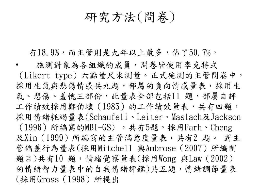 研究方法(問卷) 有18.9%,而主管則是九年以上最多,佔了50.7%。 • 施測對象為各組織的成員,問卷皆使用李克特式(Likert type)六點量尺來測量。正式施測的主管問卷中,採用生氣與悲傷情感共九題,部屬的負向情感量表,採用生氣、悲傷、羞愧三部份,此量表全部包括11 題,部屬自評工作績效採用鄭伯壎(1985)的工作績效量表,共有四題,採用情緒耗竭量表(Schaufeli、Leiter、Maslach及Jackson(1996)所編寫的MBI-GS) ,共有5題。採用Farh、Cheng 及Xin(1999)所編寫的主管滿意度量表,共有2 題。對主管偏差行為量表(採用Mitchell 與Ambrose(2007)所編制題目)共有10 題,情緒覺察量表(採用Wong 與Law(2002)的情緒智力量表中的自我情緒評鑑)共五題,情緒調節量表(採用Gross(1998)所提出