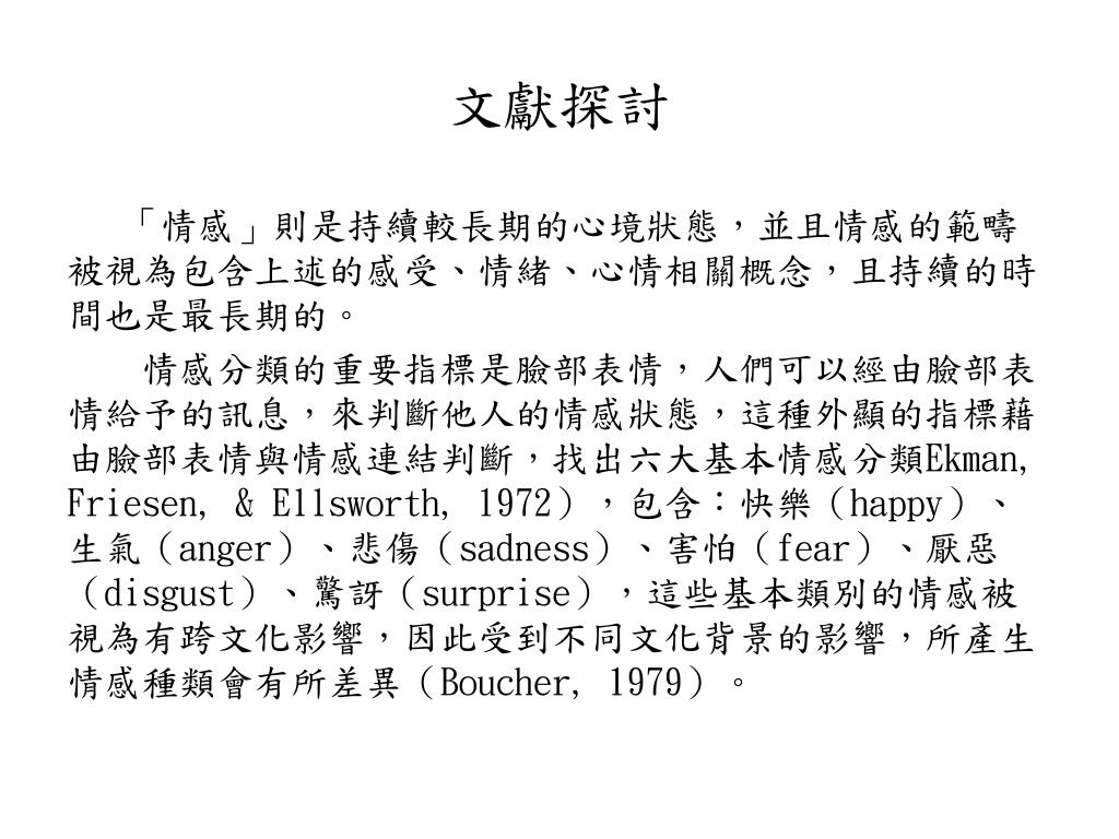 文獻探討 「情感」則是持續較長期的心境狀態,並且情感的範疇被視為包含上述的感受、情緒、心情相關概念,且持續的時間也是最長期的。 情感分類的重要指標是臉部表情,人們可以經由臉部表情給予的訊息,來判斷他人的情感狀態,這種外顯的指標藉由臉部表情與情感連結判斷,找出六大基本情感分類Ekman, Friesen, & Ellsworth, 1972),包含:快樂(happy)、生氣(anger)、悲傷(sadness)、害怕(fear)、厭惡(disgust)、驚訝(surprise),這些基本類別的情感被視為有跨文化影響,因此受到不同文化背景的影響,所產生情感種類會有所差異(Boucher, 1979)。
